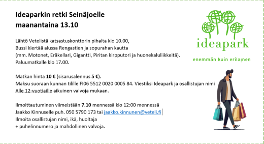 Lähtö Vetelistä katsastuskonttorin pihalta klo 10.00. Bussi kiertää alussa Rengastien ja sopurahan kautta (mm. Motonet, Eräkellari, Gigantti, Piritan kirpputori ja huonekaluliikkeitä). Paluumatkalle klo 17.00. Matkan hinta 10 € (sisarusalennus 5 €). Maksu suoraan kunnan tilille FI06 5512 0020 0005 84. Viestiksi Ideapark ja osallistujan nimi. Alle 12-vuotiaille aikuinen valvoja mukaan. Ilmoittautuminen viimeistään 7.10 mennessä klo 12:00 mennessä. Jaakko Kinnuselle puh. 050 5790 173 tai jaakko.kinnunen@veteli.fi Ilmoita osallistujan nimi, ikä, huoltaja + puhelinnumero ja mahdollinen valvoja.