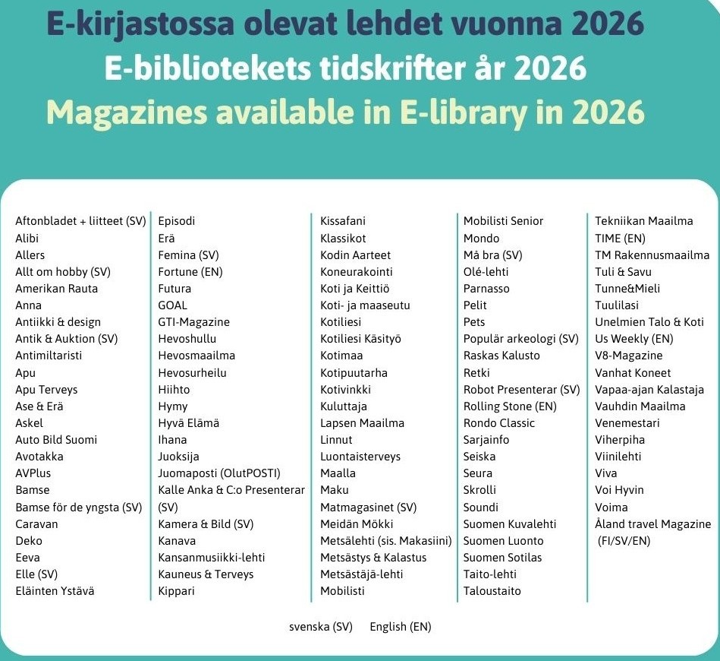Kirjaston lehtitarjonta: Tässä päivitetty lista tänä vuonna 2026 kirjastoon tulevista painetuista sanoma- ja aikakauslehdistä. Muistathan myös, että kirjaston tietokoneilta pääset lukemaan satoja sanomalehtiä digilehtinä osoitteessa epress.fi. Palvelussa pääset lukemaan myös ne Keskipohjanmaa -lehden numerot, jotka eivät ilmesty painettuina eli sunnuntain ja maanantain lehdet.