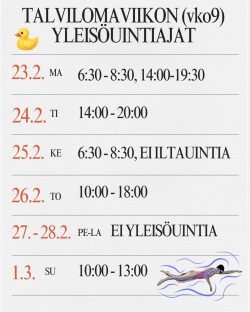 - Altaasta ja uimahallista/liikuntakeskuksesta poistuttava aukioloaikojen ja henkilökunnan ohjeistuksen mukaisesti.
