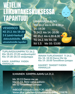 - Uimahallissa on 4 pukuhuonetta, 2 pesuhuonetta ja 2 saunaa.